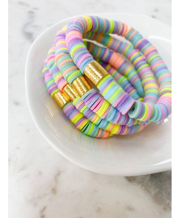 8mm heishi vinyl disc stretchy bracelet with a brushed gold accent. Great to wear as a single or stacked set!