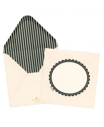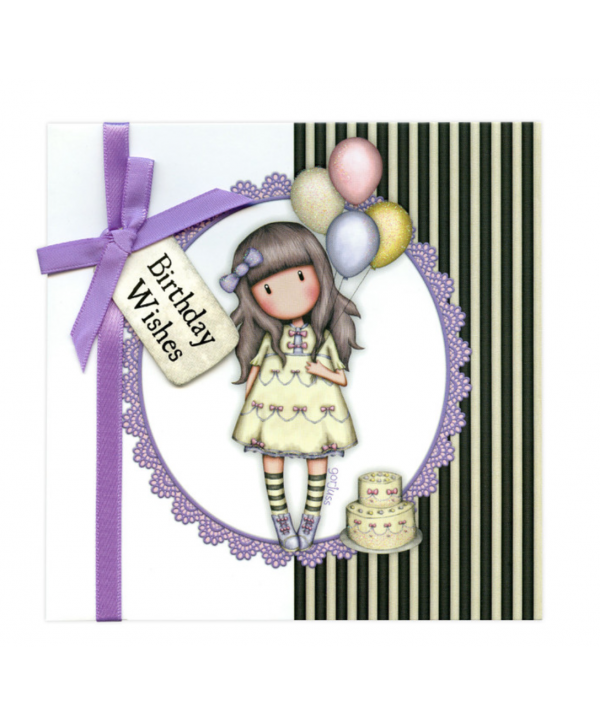 This gorjuss greeting card is decorated with gorjuss holding balloons next to a cake, surrounded by a lilac lace style frame embellished with a ribbon