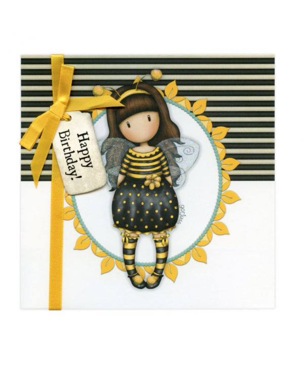 This gorjuss greeting card is designed with gorjuss dressed up like a bee, the card isembellished with a ribbon