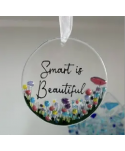 Smart is Beautiful hanging decoration • Decorative artisan fused glass suncatcher • Handmade in a studio in North Wales, UK • Materials: artisan glass and ribbon • Style: Wildflower design • Size is approximately 8cm/3inches in diameter • Supplied with gift box • Each piece is handmade and is unique, using our own copyrighted Pam Peters Designs – variation from the detail in the photograph to be expected.